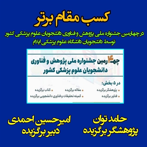 دانشجویان دانشگاه علوم پزشکی ایلام با ارائه طرحهای نوآورانه و تحقیقاتی خود موفق به کسب مقام برتر در چهارمین جشنواره ملی پژوهش و فناوری دانشجویان علوم پزشکی کشور شدند.